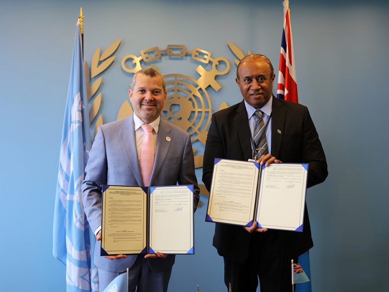حيث وقع الأمين العام للمنظمة البحرية الدولية أرسينيو دومينجيز ووزير الأشغال العامة وخدمات الأرصاد الجوية والنقل في جمهورية فيجي، رو فيليبي تويساواو، مذكرة تفاهم في مقر المنظمة البحرية الدولية في لندن لوضع ترتيبات عمل المكتب.