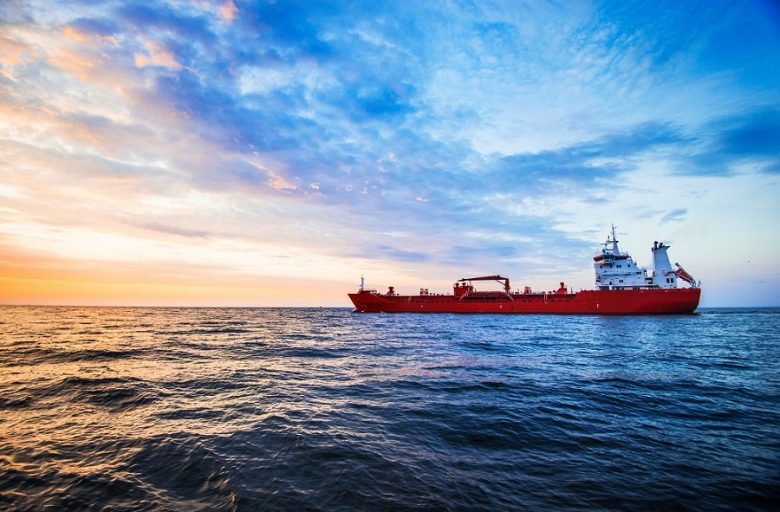 Colorful sunset over the North sea and tanker cargo ship on a background, Netherlands