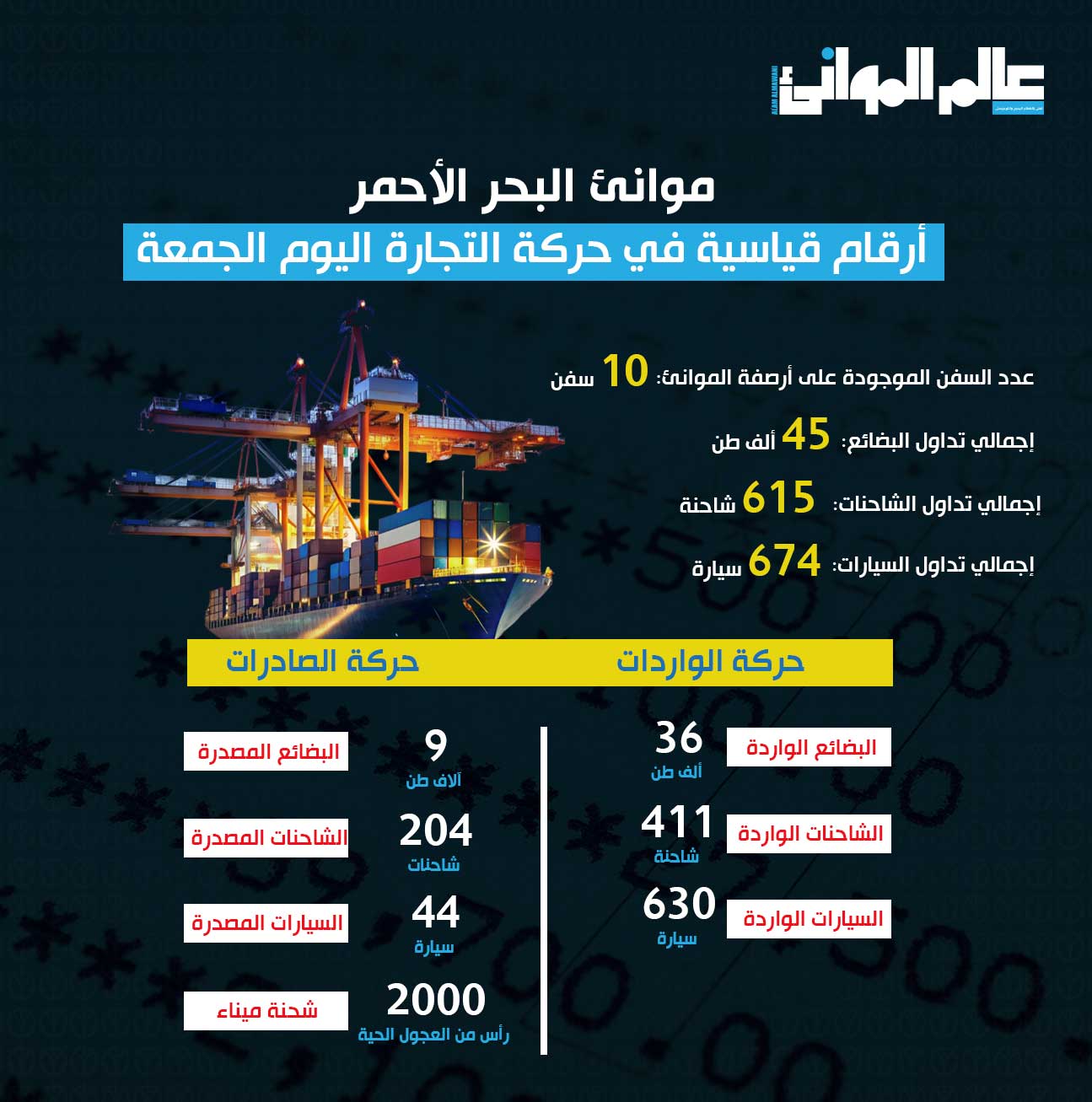 وتفصيلًا وصلت حركة تداول البضائع إلى 45 ألف طن من البضائع المتنوعة. فيما تم تداول 615 شاحنة و674 سيارة. هذا الأداء القوي يبرز الدور الحيوي الذي تؤديه موانئ البحر الأحمر كبوابة رئيسة للتجارة المصرية مع العالم.